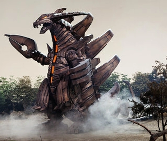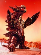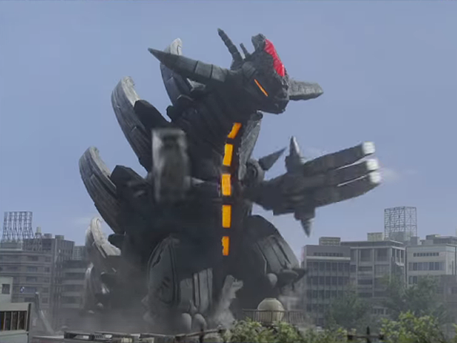 Grand King Megalos (グランドキングメガロス, Gurando Kingu Megarosu) was one of the many monster crystals that was in the possession of Saki Mitsurugi. As Ultraman Rosso and Ultraman Blu were engaged in a battle with the monster, Gomora, Saki used her Gyro to transform into the robot to face the ultraman brothers herself. Gomora was the first to attack Grand King Megalos by blasting it with his Super Oscillatory Ray. However, not only did the robot take the attack without flinching, but it easily destroyed Gomora with one blast of its Megalos Blaster before turning its attention towards the ultraman brothers. Rosso and Blu fought their best, but Grand King Megalos's armor was too strong for any of their attacks to do any harm to it. When Katsumi tried to reason with Saki that she was disregarding the original Rosso and Blu's wishes by trying to end all life on Earth, she continued to ignore his concerns by attacking them with the robot's generated blade.